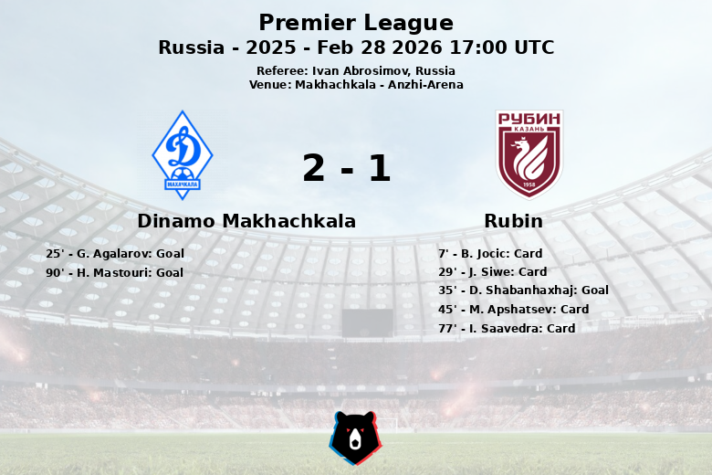 El Dinamo Makhachkala dominó la posesión del balón con un 61%, buscando constantemente la portería rival. Sin embargo, fue el Rubin quien generó las primeras acciones polémicas, con una tarjeta amarilla temprana para B. Jocic en el minuto 7. En el minuto 25, G. Agalarov adelantó al Dinamo desde el punto penal, tras una falta dentro del área. El Rubin respondió diez minutos después, con un gol de D. Shabanhaxhaj, igualando el marcador. La primera mitad concluyó con una amarilla para M. Apshatsev del Rubin, presagiando una segunda parte igualmente disputada.