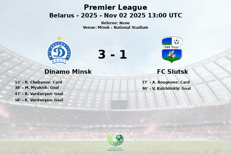 Minsk, Bielorrusia – El Dinamo Minsk se impuso al FC Slutsk en el Estadio Nacional en un partido correspondiente a la jornada 27 de la Premier League bielorrusa. El equipo local demostró superioridad, especialmente en la primera mitad, con goles de M. Myakish al minuto 38, asistido por K. Vardanyan, seguido de un tanto del propio Vardanyan al minuto 43, esta vez con asistencia de E. Malashevich. Vardanyan volvió a perforar la red rival al minuto 58, ampliando la ventaja para el Dinamo Minsk. El partido también tuvo momentos de tensión, evidenciados por las tarjetas amarillas mostradas a R. Chobanov del Dinamo Minsk en el minuto 13 y a A. Bougnone del FC Slutsk en el minuto 77. En los últimos minutos, V. Kulchitskiy descontó para el FC Slutsk en el minuto 90, pero no fue suficiente para cambiar el destino del encuentro. A pesar de la falta de datos específicos sobre posesión, tiros, corners y faltas, la contundencia del Dinamo Minsk en el marcador refleja su dominio en el terreno de juego.