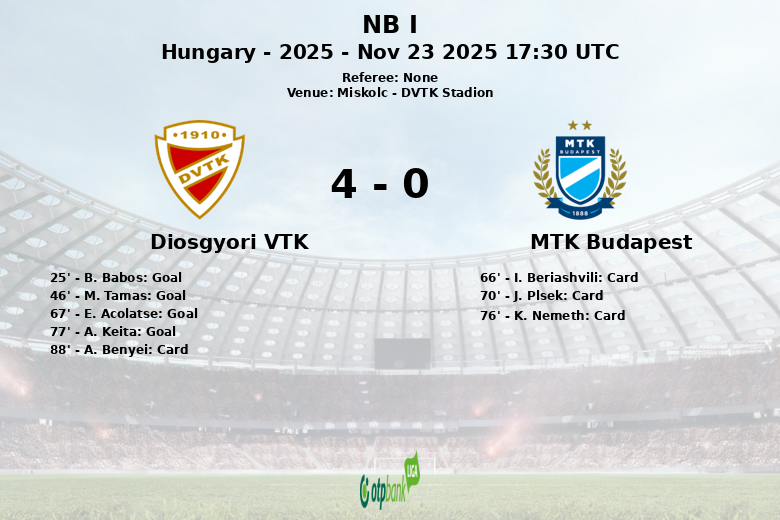 B. Babos abrió el marcador para el Diosgyori VTK en el minuto 25, dando una ventaja inicial a su equipo. Tras el descanso, M. Tamas amplió la ventaja en el minuto 46, asistido por E. Acolatse. Acolatse se convertiría en protagonista al anotar de penalti en el minuto 67, tras una tarjeta roja mostrada a I. Beriashvili del MTK Budapest un minuto antes. A. Keita cerró la cuenta para el Diosgyori VTK en el minuto 77, sellando una victoria cómoda.