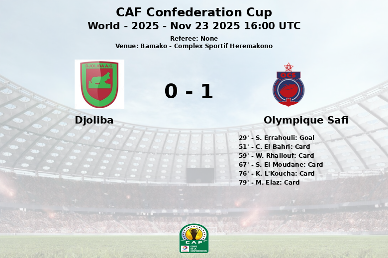 En un partido disputado en el Complex Sportif Heremakono de Bamako, el Olympique Safi logró una importante victoria ante el Djoliba en el marco de la CAF Confederation Cup. El encuentro, parte de la primera ronda de la competición, vio al Safi imponerse gracias a un gol de S. Errahouli en el minuto 29, con asistencia de S. El Moudane.