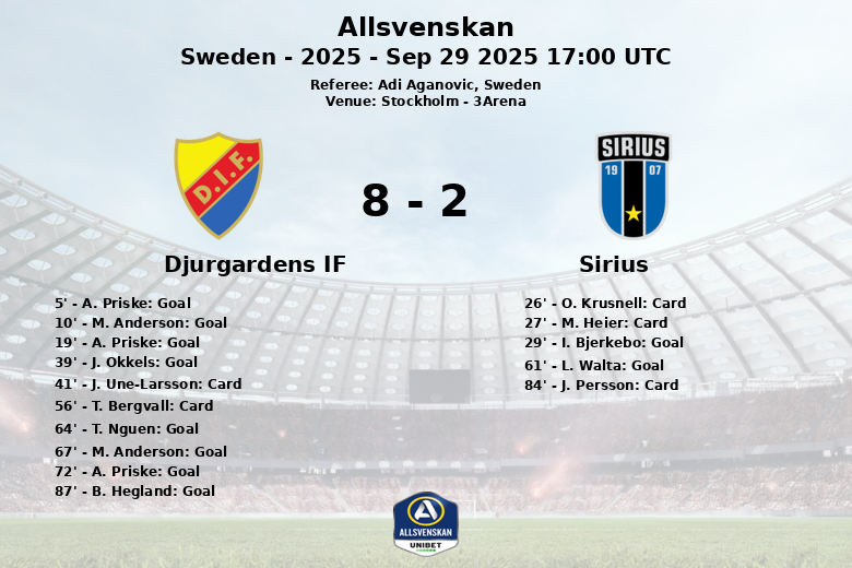 Sirius intentó reaccionar, e I. Bjerkebo descontó al minuto 29 con asistencia de M. Heier. Sin embargo, la respuesta de Djurgardens fue inmediata. J. Okkels marcó a los 39 minutos, asistido por O. Fallenius. Tras el descanso, L. Walta anotó para Sirius al minuto 61, pero la esperanza visitante fue efímera. T. Nguen (64′) y nuevamente M. Anderson (67′) ampliaron la diferencia para Djurgardens, con Nguen asistiendo el gol de Anderson. A. Priske completó su hat-trick al minuto 72, asistido esta vez por Anderson, sellando una actuación memorable. El marcador lo cerraron B. Hegland al minuto 87, con asistencia de A. Ekdal.