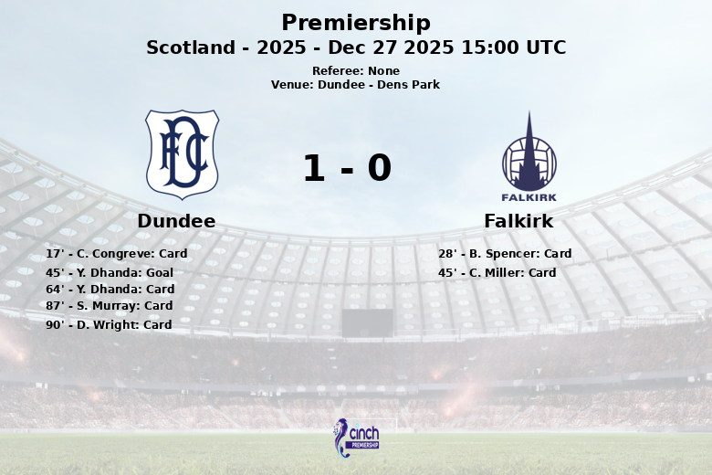 Por su parte, el Falkirk dominó la posesión del balón y generó un mayor número de disparos (22 frente a 10), pero careció de la puntería necesaria para perforar la defensa local, encontrando únicamente un tiro a puerta de los 22 generados. Su frustración se tradujo en 20 faltas y dos tarjetas amarillas (B. Spencer y C. Miller). El partido, correspondiente a la jornada 19 de la Premiership escocesa, dejó un sabor agridulce para el Falkirk, que deberá mejorar su efectividad de cara al gol si quiere aspirar a mejores resultados. El Dundee, por su parte, celebra una victoria trabajada en un partido que se recordará por su intensidad.