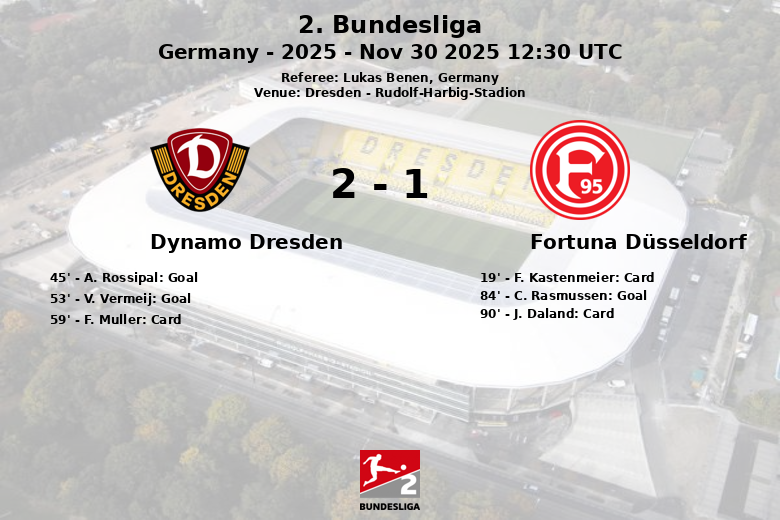 En la segunda mitad, V. Vermeij amplió la ventaja para el Dynamo Dresden al minuto 53, con asistencia de N. Hauptmann. F. Muller del Dynamo Dresden también recibió una tarjeta amarilla al minuto 59. El Fortuna Düsseldorf intentó reaccionar, y C. Rasmussen descontó al minuto 84, asistido por C. Itten. Sin embargo, no fue suficiente para igualar el marcador.