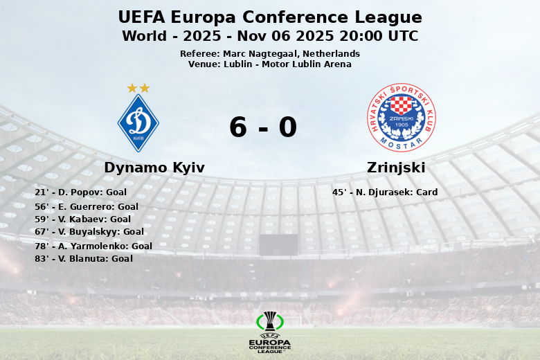 Lublin, 6 de noviembre de 2025 – El Dynamo Kyiv demostró su superioridad en el campo del Motor Lublin Arena al aplastar al Zrinjski en un partido correspondiente a la fase de grupos de la UEFA Europa Conference League. El encuentro, arbitrado por Marc Nagtegaal, se caracterizó por un claro dominio del equipo ucraniano, que controló el 65% de la posesión del balón.