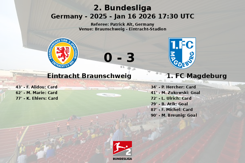 Braunschweig, Alemania – El 1. FC Magdeburg se impuso con autoridad al Eintracht Braunschweig en un partido disputado en el Eintracht-Stadion, correspondiente a la jornada 18 de la 2. Bundesliga. El encuentro, arbitrado por Patrick Alt, finalizó con un marcador favorable al Magdeburg, reflejo de su superioridad en el campo.