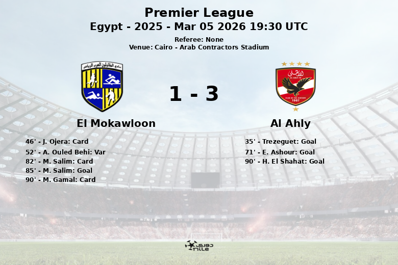 Cairo, Egipto – En un encuentro disputado en el Arab Contractors Stadium, Al Ahly venció a El Mokawloon en un partido que tuvo momentos de alta tensión. Al Ahly dominó la posesión con un 69% frente al 31% de El Mokawloon. El primer gol llegó al minuto 35, cortesía de Trezeguet, asistido por E. Ashour, poniendo a Al Ahly en ventaja.