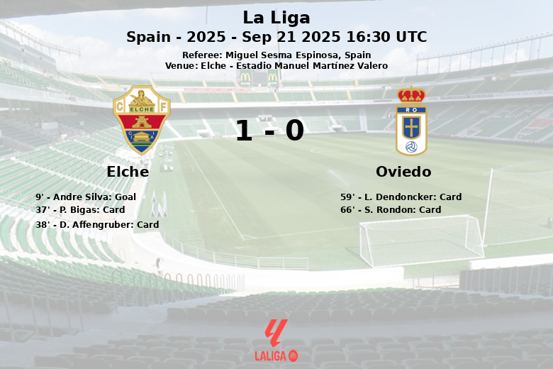 El partido estuvo marcado por la intensidad y la disputa en el mediocampo. El colegiado Miguel Sesma Espinosa se vio obligado a mostrar tarjetas amarillas para mantener el orden, amonestando a dos jugadores del Elche (Bigas y Affengruber) y a otros dos del Oviedo (Dendoncker y Rondón). En total, el Oviedo cometió 18 faltas, mientras que el Elche realizó 9. El encuentro, correspondiente a la quinta jornada de La Liga, se disputó en el Estadio Manuel Martínez Valero de Elche. Finalmente, el Elche se llevó los tres puntos en juego tras un partido muy trabajado. El resultado final fue de 1 a 0.