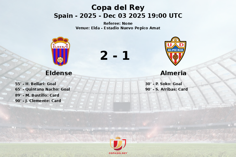 Elda, España – En un partido disputado en el Estadio Nuevo Pepico Amat, el Eldense logró una impresionante remontada frente al Almería en la Copa del Rey. El Almería se adelantó en el minuto 30 gracias a un gol de P. Soko, asistido por I. Baba. Sin embargo, el Eldense respondió con fuerza en la segunda mitad. H. Bellari igualó el marcador en el minuto 55 y Quintana Nacho completó la remontada en el minuto 65, con una asistencia de A. Ibarrondo. El partido estuvo marcado por la intensidad, reflejada en las tarjetas amarillas mostradas a M. Bustillo (Eldense) en el minuto 89, y a S. Arribas (Almería) y J. Clemente (Eldense) en el minuto 90.