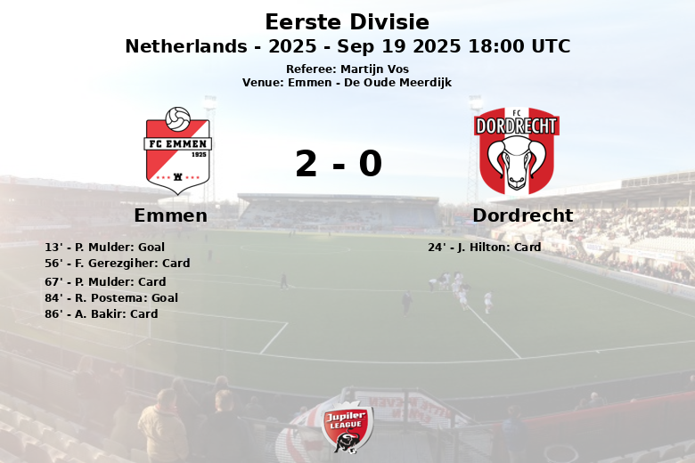 El Emmen abrió el marcador temprano, en el minuto 13, con un gol de P. Mulder, asistido por F. Gerezgiher. El resto de la primera mitad transcurrió sin mayores sobresaltos, más allá de una tarjeta amarilla para J. Hilton del Dordrecht en el minuto 24.