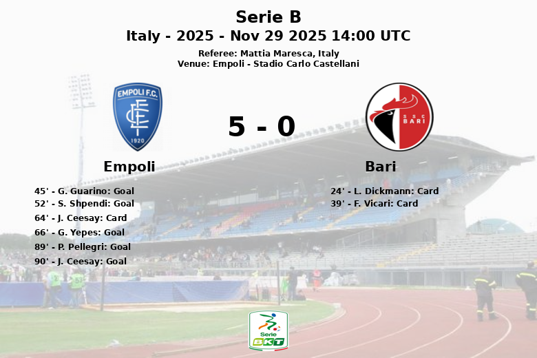 Bari, por su parte, tuvo dificultades para crear oportunidades claras de gol, registrando apenas 6 tiros, ninguno de ellos con dirección a la portería. El equipo también recibió dos tarjetas amarillas, una para L. Dickmann al minuto 24 y otra para F. Vicari al minuto 39. Empoli también sumaría una tarjeta amarilla a J. Ceesay al minuto 64. Si bien Bari mantuvo un 49% de la posesión, no logró traducirla en acciones ofensivas concretas.