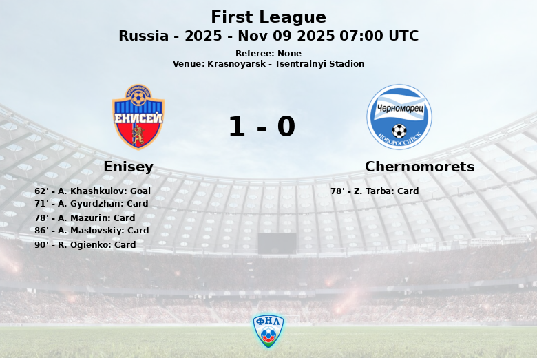 Krasnoyarsk fue testigo de un encuentro reñido entre el Enisey y el Chernomorets en el Tsentralnyi Stadion, correspondiente a la fecha 18 de la temporada regular de la First League rusa. El partido, jugado el 9 de noviembre de 2025, se definió por un solitario gol de penal de A. Khashkulov al minuto 62, dándole la victoria al Enisey.