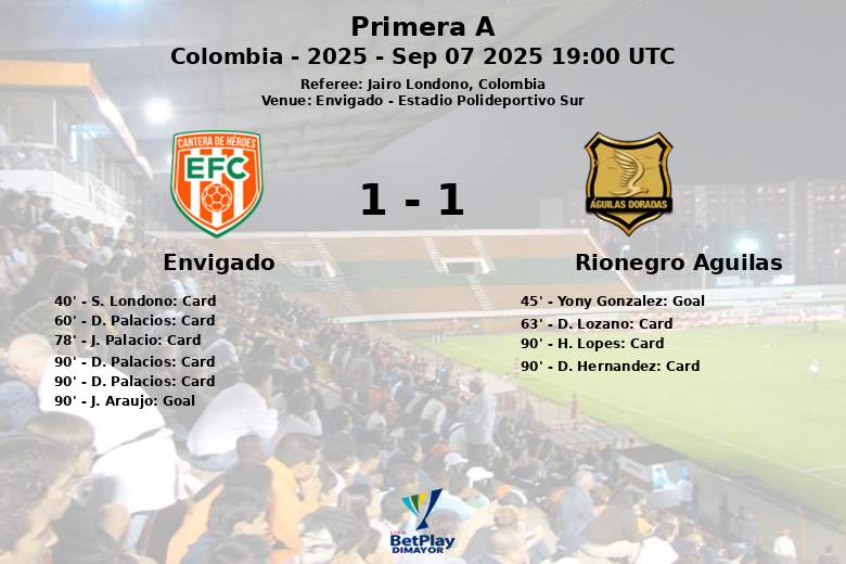 Envigado y Rionegro Águilas igualaron en un partido disputado en el Estadio Polideportivo Sur, válido por la fecha 10 del Clausura de la Primera A colombiana. A pesar de dominar la posesión con un 60%, Envigado tuvo que remar contracorriente para rescatar un punto.
