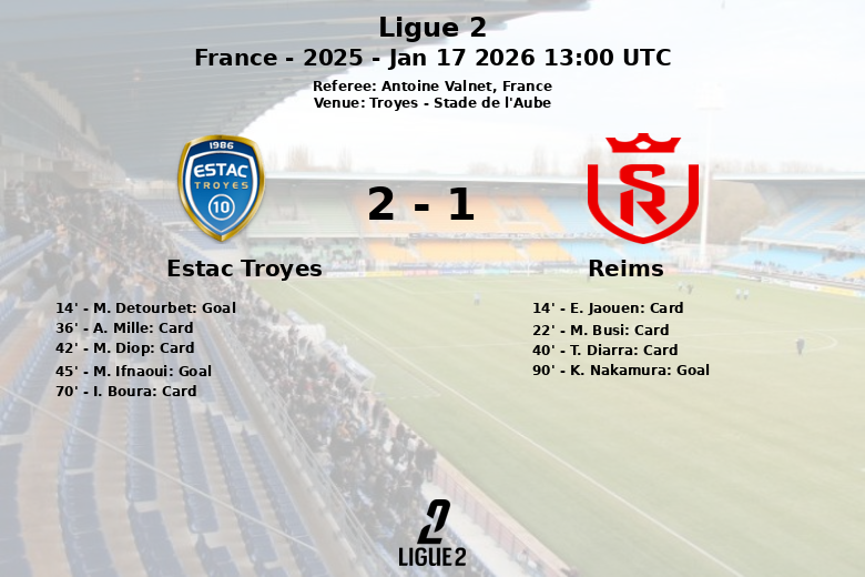 La segunda mitad fue aún más tensa, con la expulsión de M. Diop del Troyes al minuto 42, obligando al equipo local a jugar con diez hombres durante gran parte del segundo tiempo. A pesar de la inferioridad numérica, el Troyes se mantuvo firme en defensa, aunque el Reims, con un 62% de posesión y 8 saques de esquina, intentó insistentemente reducir la diferencia. K. Nakamura logró descontar para el Reims en el minuto 90, pero no fue suficiente para cambiar el resultado final. El partido concluyó con un total de 12 faltas cometidas por el Troyes y 18 por el Reims, reflejando la intensidad del juego. A pesar de tener menos tiros a puerta (3 contra 3), el Troyes fue más eficaz, capitalizando sus oportunidades para llevarse la victoria en casa.