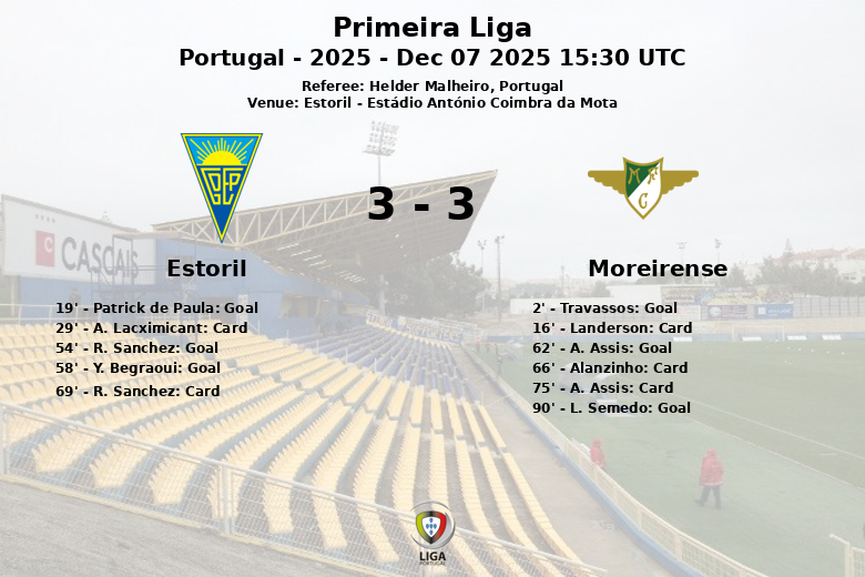 El partido comenzó con un Moreirense dominante que se adelantó temprano con un gol de Travassos en el minuto 2, con asistencia de Guilherme Schettine. Estoril reaccionó y Patrick de Paula igualó el marcador en el minuto 19, asistido por R. Sanchez. La primera mitad finalizó con un empate que anticipaba una segunda parte intensa.