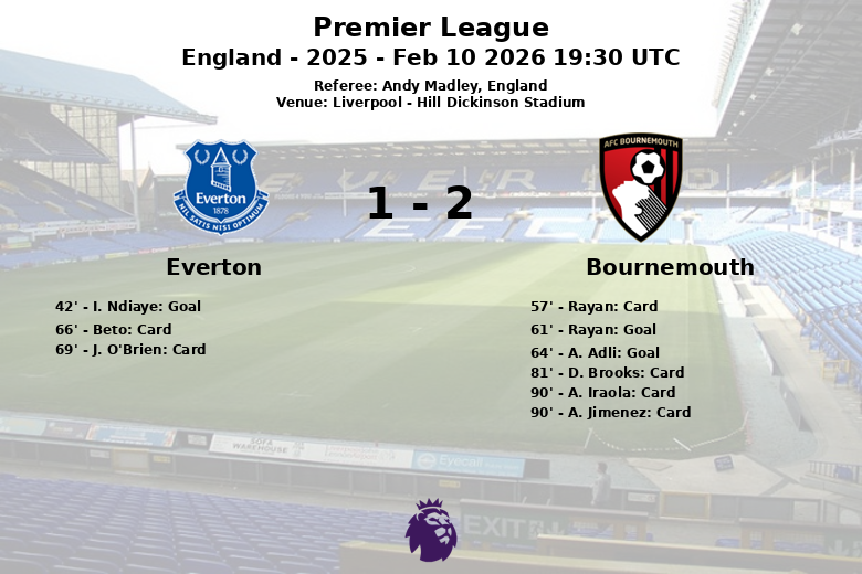 El partido comenzó con un penal convertido por I. Ndiaye en el minuto 42, dando la ventaja al Everton. Sin embargo, en la segunda mitad, el Bournemouth reaccionó con contundencia. Rayan empató el encuentro en el minuto 61, asistido por A. Truffert, y solo tres minutos después, A. Adli, con asistencia de J. Hill, puso el 1-2 definitivo en el marcador.