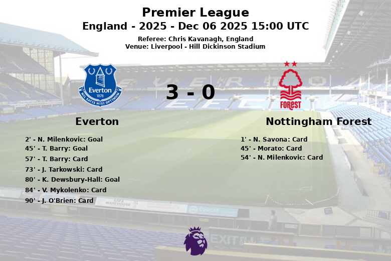 En un encuentro correspondiente a la jornada 15 de la Premier League, el Everton derrotó al Nottingham Forest por un marcador de 3 a 0 en el Hill Dickinson Stadium de Liverpool. El partido, arbitrado por Chris Kavanagh, estuvo marcado por la intensidad y varias tarjetas amarillas.