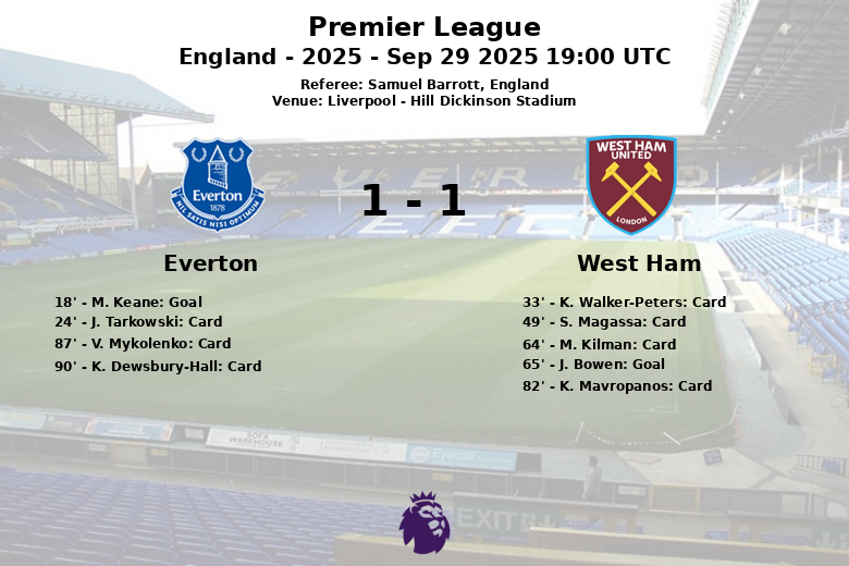 Liverpool, Inglaterra – En un encuentro disputado en el Hill Dickinson Stadium, Everton y West Ham United igualaron en un partido marcado por las tarjetas y la lucha en el mediocampo. El partido, válido por la sexta jornada de la Premier League, terminó con un marcador de 1-1.