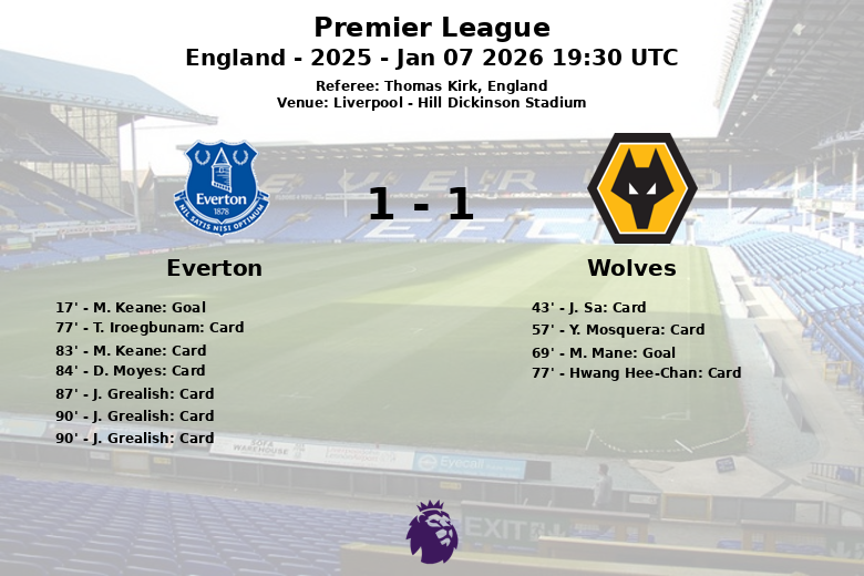El Everton se adelantó en el minuto 17 gracias a un gol de M. Keane, asistido por T. Iroegbunam. Sin embargo, el Wolves reaccionó en la segunda mitad, igualando el marcador en el minuto 69 con un tanto de M. Mane, tras una asistencia de J. S. Larsen.