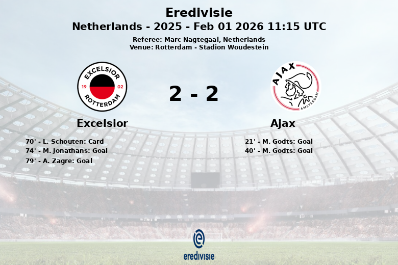 Sin embargo, en la segunda parte, el Excelsior resurgió con fuerza. M. Jonathans descontó para los locales al minuto 74, con asistencia de G. de Regt, y tan solo cinco minutos después, A. Zagre igualó el marcador, también asistido por G. de Regt, desatando la euforia en las gradas. El partido, que había pintado de blanco y rojo en la primera mitad, terminó con un justo empate, reflejo del esfuerzo y la garra mostrada por el Excelsior en la segunda parte. El árbitro Marc Nagtegaal amonestó a L. Schouten del Excelsior en el minuto 70. El partido, aunque parejo en posesión (51% para Ajax y 49% para Excelsior), vio al Excelsior generar más tiros (11 contra 9 del Ajax).