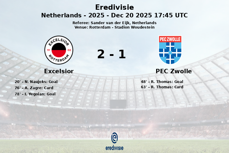 El Excelsior abrió el marcador en el minuto 20 gracias a un gol de N. Naujoks, asistido por D. Sanches Fernandes, dando una temprana ventaja al equipo local. Sin embargo, el PEC Zwolle respondió en la segunda mitad, con R. Thomas anotando en el minuto 48, tras una asistencia de S. Floranus, igualando las acciones. Thomas recibió una tarjeta amarilla en el minuto 63.