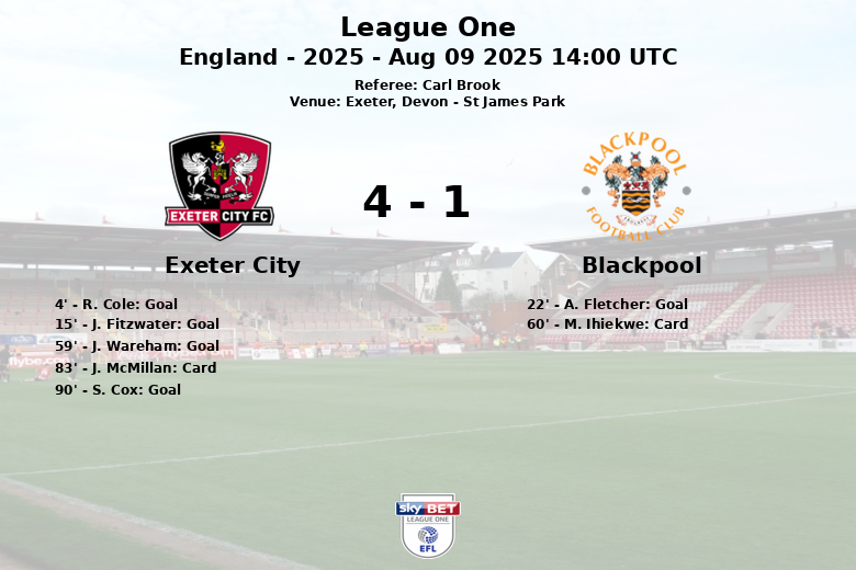 Exeter, Devon – El Exeter City se impuso con autoridad al Blackpool en un vibrante encuentro disputado en St James Park, correspondiente a la segunda jornada de la League One. El partido, arbitrado por Carl Brook, vio al Exeter City mostrar una gran efectividad de cara al gol, respaldada por una sólida actuación general.