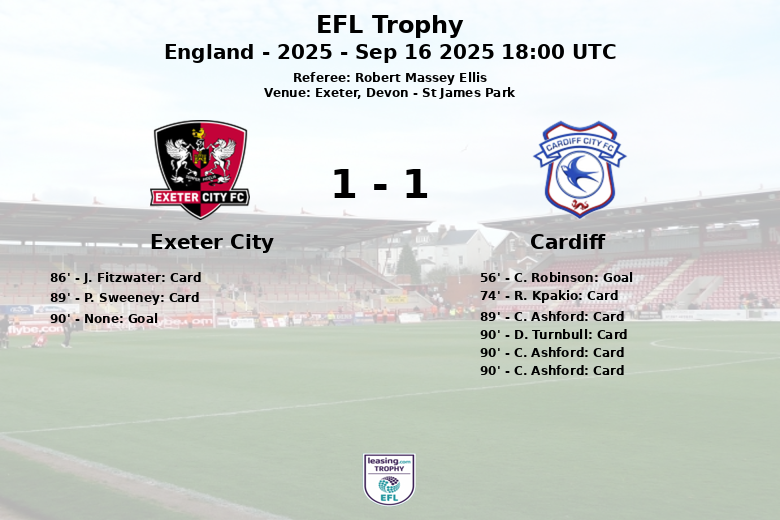 El partido estuvo marcado por una serie de tarjetas. El Cardiff recibió cuatro amarillas, incluyendo dos a C. Ashford, lo que resultó en una tarjeta roja para el jugador en el tiempo añadido. El Exeter City también recibió dos tarjetas amarillas. El árbitro Robert Massey Ellis tuvo trabajo para mantener el control del encuentro, especialmente en los agitados minutos finales. El encuentro, correspondiente a la EFL Trophy, temporada 2025, ronda Southern – 1, deja un sabor amargo para el Cardiff, que vio escapar la victoria en el último suspiro.