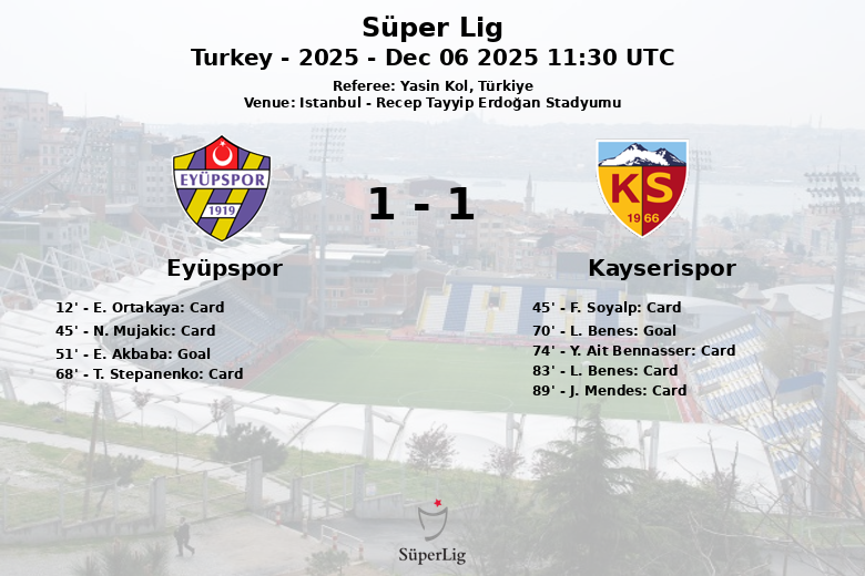 El primer tiempo estuvo marcado por las tarjetas amarillas, con E. Ortakaya del Eyüpspor siendo amonestado al minuto 12, seguido por N. Mujakic (Eyüpspor) y F. Soyalp (Kayserispor) justo antes del descanso. E. Akbaba adelantó al Eyüpspor en el minuto 51 con un gol, pero L. Benes empató para el Kayserispor en el minuto 70 con asistencia de J. Mendes.