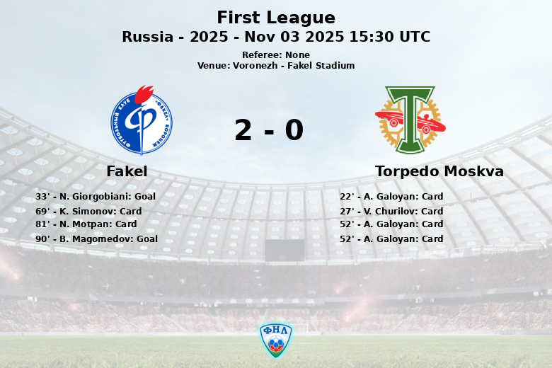 Voronezh, Rusia – El Fakel se llevó la victoria en casa ante el Torpedo Moskva en un encuentro disputado en el Fakel Stadium, válido por la fecha 17 de la First League rusa. El partido, jugado el 3 de noviembre de 2025, estuvo marcado por la intensidad y la disciplina, con múltiples tarjetas mostradas por el árbitro.