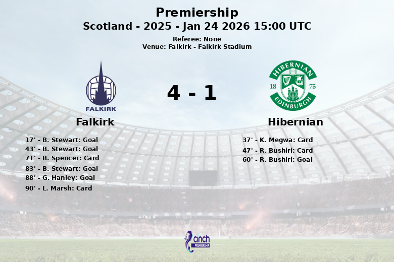 La segunda mitad trajo consigo más acción. R. Bushiri del Hibernian recibió una tarjeta amarilla al minuto 47. El Hibernian intentó reaccionar y R. Bushiri descontó al minuto 60 con asistencia de J. Obita. Sin embargo, el Falkirk mantuvo la presión, y B. Stewart completó su hat-trick al minuto 83, sin asistencia en esta ocasión. Un desafortunado autogol de G. Hanley al minuto 88 sentenció el partido en favor del Falkirk. Hubo tarjetas amarillas para B. Spencer del Falkirk al minuto 71 y L. Marsh al minuto 90.
