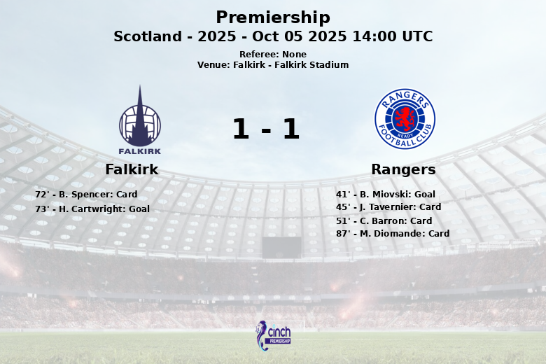 Falkirk, Escocia – En un encuentro cargado de intensidad y emoción, el Falkirk y los Rangers empataron con un marcador de 1 a 1 en el Falkirk Stadium. El partido, correspondiente a la séptima jornada de la Premiership escocesa, vio a los Rangers tomar la delantera en el minuto 41 gracias a un gol de B. Miovski, asistido por D. Cornelius.
