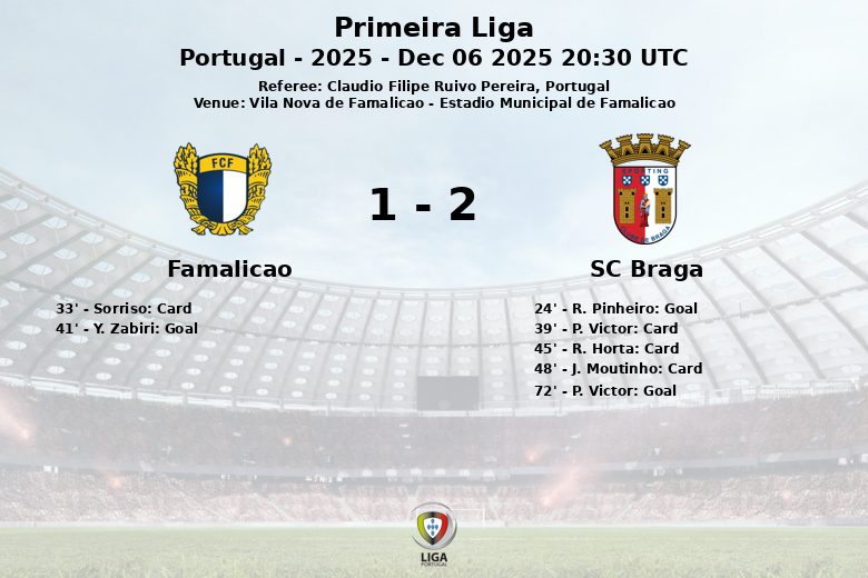 El partido comenzó con un autogol de R. Pinheiro al minuto 24, dándole la ventaja inicial al SC Braga. Sin embargo, el Famalicao respondió con un gol de Y. Zabiri al minuto 41, tras una asistencia de Sorriso. La primera mitad también estuvo marcada por tarjetas amarillas para Sorriso del Famalicao y P. Victor y R. Horta del SC Braga.