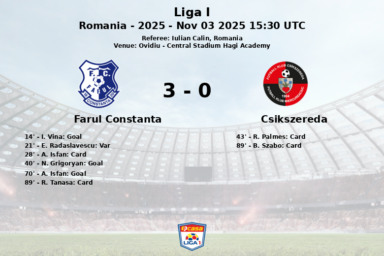 Ovidiu, Rumania – El Farul Constanta se impuso al Csikszereda en un encuentro disputado en el Central Stadium Hagi Academy, con una victoria que reflejó su dominio en la posesión y su mayor efectividad de cara al gol. El partido, correspondiente a la jornada 15 de la Liga I, temporada 2025, fue arbitrado por Iulian Calin.