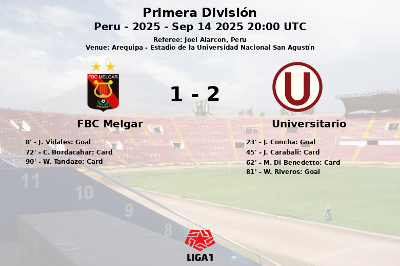 Arequipa fue testigo de un vibrante encuentro entre FBC Melgar y Universitario, válido por la octava jornada del Apertura en la Primera División peruana. El partido, disputado en el Estadio de la Universidad Nacional San Agustín, finalizó con un marcador de 1-2 a favor de los cremas.