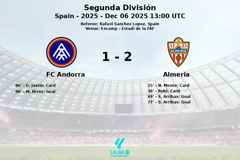 El partido estuvo marcado por la intensidad y el juego disputado, reflejado en las tres tarjetas amarillas mostradas, dos para el Almería y una para el Andorra. El Almería abrió el marcador en el minuto 69 gracias a un tanto de S. Arribas, con asistencia de S. Dzodic. El propio Arribas amplió la ventaja en el minuto 77. Cuando parecía que el Almería se llevaría una victoria cómoda, el Andorra recortó distancias en el minuto 90 con un gol de M. Nieto, asistido por E. Akman.