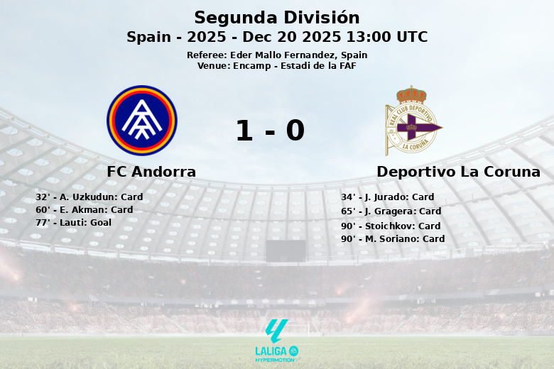 A pesar del dominio territorial del Andorra, el Deportivo La Coruña buscó sus oportunidades, aunque con menos efectividad de cara a la portería rival. El único gol del encuentro llegó en el minuto 77, obra de Lauti, quien dio la victoria al equipo local. Andorra realizó 11 tiros de los cuales 4 fueron a puerta. El Deportivo La Coruña, por su parte, generó 10 remates, con solo uno que encontró el arco. El encuentro fue dirigido por el árbitro Eder Mallo Fernández.