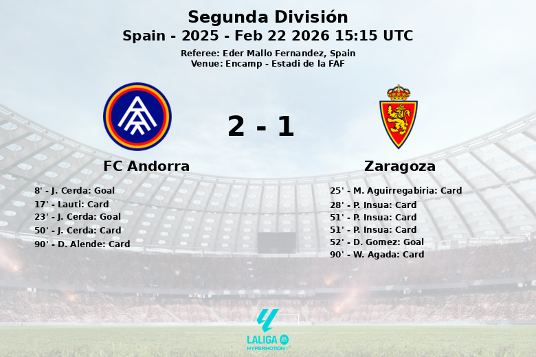 J. Cerda se erigió como la figura del encuentro al anotar dos goles para el FC Andorra, uno a los 8 minutos y otro a los 23, el segundo con asistencia de Y. Cabanzon. El dominio del Andorra se tradujo en una posesión del 62% y un mayor número de remates, 17 en total, de los cuales 6 fueron dirigidos a portería.
