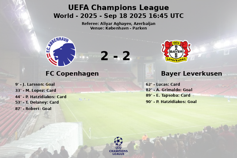 El partido comenzó con un FC Copenhagen agresivo que sorprendió al Bayer Leverkusen desde el inicio. Al minuto 9, J. Larsson, asistido por E. Achouri, abrió el marcador para los locales con un gol que hizo vibrar a la afición. El Bayer Leverkusen intentó reaccionar, pero se encontró con una defensa bien plantada y un equipo danés que supo aprovechar sus oportunidades. El encuentro se vio interrumpido por varias tarjetas amarillas, mostrando la intensidad con la que se disputaba cada balón.