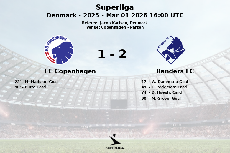 El Randers FC sorprendió al adelantarse en el marcador en el minuto 17 gracias a un gol de W. Dammers, asistido por M. Greve. Sin embargo, el FC Copenhagen respondió rápidamente, con M. Madsen igualando el encuentro en el minuto 22, tras una asistencia de J. Larsson.
