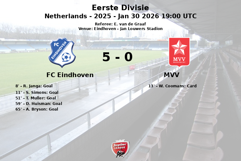 El festival de goles comenzó temprano, con R. Janga abriendo el marcador para el FC Eindhoven desde el punto penal al minuto 8. Apenas tres minutos después, S. Simons amplió la ventaja con un gol de jugada, asistido por A. Bryson. El MVV intentó reaccionar, pero se vio frustrado por la defensa local. W. Coomans del MVV recibió una tarjeta amarilla al minuto 13.