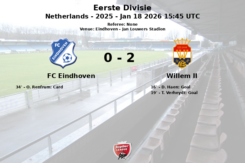 El encuentro fue intenso, con 12 faltas cometidas por el Willem II y 11 por el FC Eindhoven. O. Renfrum del FC Eindhoven recibió una tarjeta amarilla en el minuto 34. Finalmente, el marcador no se movió más, sellando una importante victoria para el Willem II en su búsqueda por ascender en la tabla.