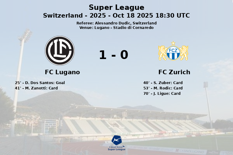 Lugano, Suiza – El FC Lugano se impuso al FC Zurich en un encuentro disputado en el Stadio di Cornaredo el 18 de octubre de 2025, correspondiente a la novena jornada de la Super League suiza. El único gol del partido llegó en el minuto 25, obra de D. Dos Santos tras una asistencia de M. Zanotti, desatando la euforia en la afición local.