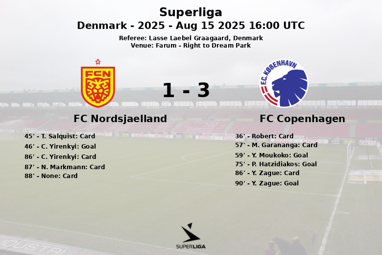 Farum, Dinamarca – En un encuentro disputado en el Right to Dream Park, el FC Copenhague logró una importante victoria contra el FC Nordsjaelland en un partido correspondiente a la quinta jornada de la Superliga danesa. El encuentro, arbitrado por Lasse Laebel Graagaard, estuvo marcado por la intensidad y la polémica, con un total de seis tarjetas amarillas y una roja.