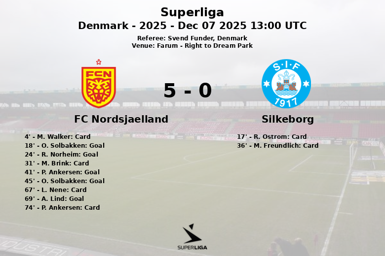 O. Solbakken abrió el marcador con un penal en el minuto 18, seguido rápidamente por un gol de R. Norheim en el minuto 24. La ofensiva del Nordsjaelland continuó imparable, con P. Ankersen anotando en el minuto 41 y Solbakken marcando su segundo del partido justo antes del descanso en el minuto 45, ampliando la ventaja a 4-0.