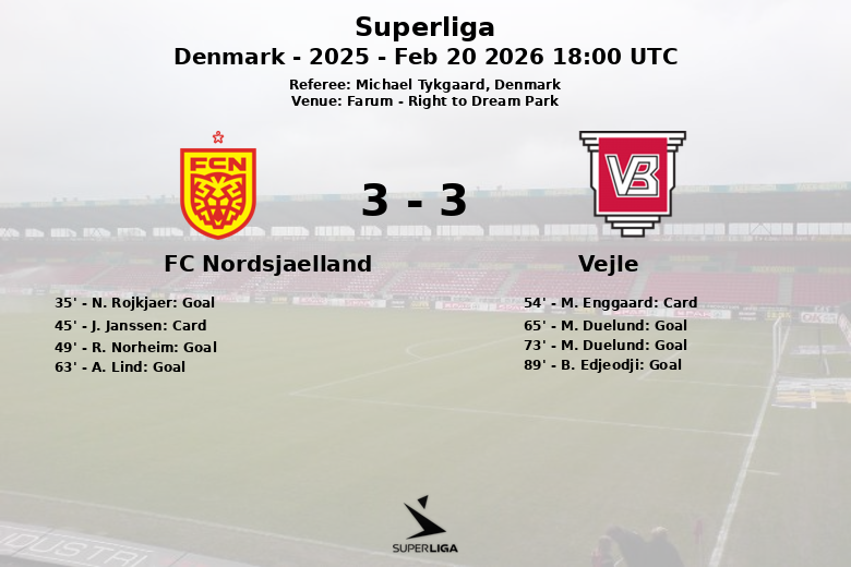 El partido, arbitrado por Michael Tykgaard, fue parte de la jornada 21 de la Superliga danesa. El Nordsjaelland generó 11 tiros, de los cuales 7 fueron a puerta, mientras que Vejle realizó 15 tiros, 6 de ellos a puerta. El partido fue vibrante desde el principio hasta el final.