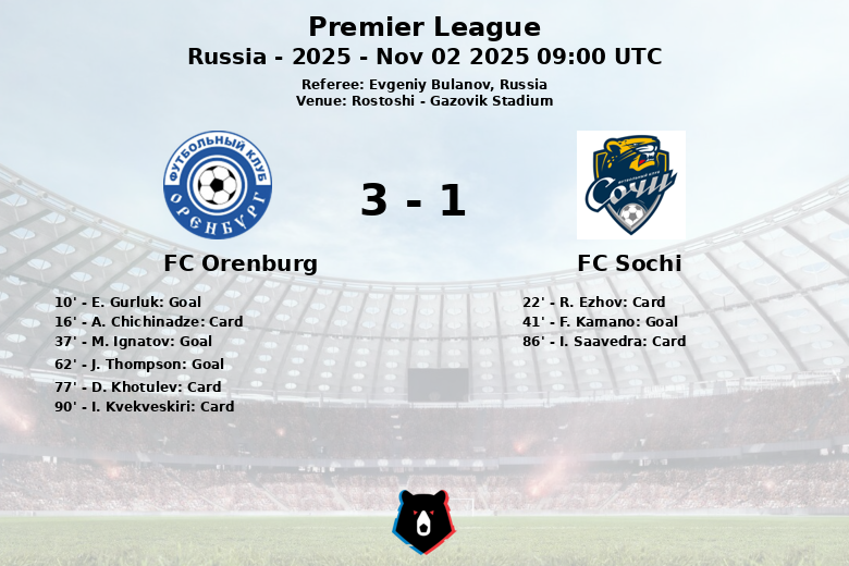 FC Orenburg abrió el marcador temprano, al minuto 10, gracias a un gol de E. Gurluk con asistencia de J. Thompson. Sin embargo, el FC Sochi respondió con un gol en propia puerta de M. Ignatov al minuto 37 y otro tanto de F. Kamano al minuto 41, volteando el marcador antes del descanso.