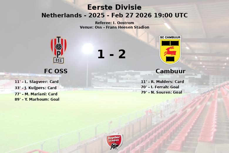 El Cambuur logró abrir el marcador en el minuto 70 gracias a un gol de I. Ferrah, asistido por T. Rolke. Poco después, en el minuto 79, N. Souren amplió la ventaja para el Cambuur. El FC OSS no se rindió y consiguió recortar distancias en el minuto 89 con un penalti transformado por Y. Marhoum, pero no fue suficiente para evitar la derrota. El FC OSS terminó con 3 tarjetas amarillas, mientras que el Cambuur vio una.