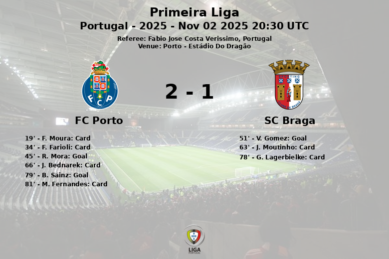 En la segunda mitad, V. Gomez igualó el marcador para el SC Braga al minuto 51, asistido por R. Zalazar. Sin embargo, el Porto no se amilanó y, al minuto 79, B. Sainz marcó el gol de la victoria con una asistencia de G. Veiga. El partido fue intenso y disputado, reflejado en las numerosas tarjetas amarillas mostradas, incluyendo una para J. Moutinho del Braga y para J. Bednarek y M. Fernandes del Porto.