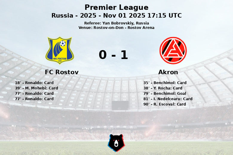 Rostov-on-Don, Rusia – En un partido cargado de tensión y amonestaciones, Akron logró una importante victoria como visitante ante el FC Rostov en el Rostov Arena. El encuentro, correspondiente a la jornada 14 de la Premier League rusa, finalizó con un apretado marcador que refleja la paridad en el juego, aunque las tarjetas marcaron el desarrollo.