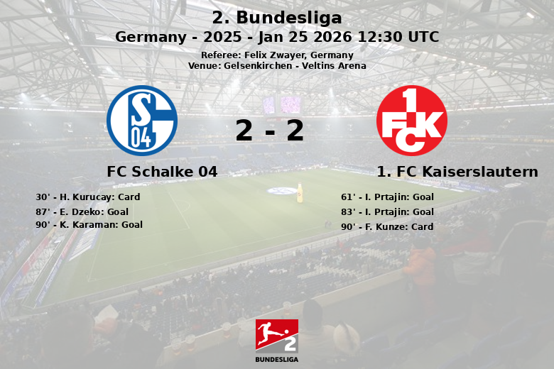 Gelsenkirchen fue testigo de un vibrante encuentro de la 2. Bundesliga donde el FC Schalke 04 y el 1. FC Kaiserslautern igualaron en un partido lleno de alternativas y goles. A pesar de dominar la posesión con un 61%, el Schalke se encontró con un rival bien plantado que aprovechó sus oportunidades. El Kaiserslautern se adelantó en el marcador al minuto 61 con un gol de I. Prtajin, tras una asistencia de N. Skytta. Prtajin volvió a marcar en el minuto 83, tras una asistencia de D. Hanslik, colocando el 0-2 en el marcador. Cuando parecía que la victoria se iba para Kaiserslautern, el Schalke reaccionó con goles de E. Dzeko en el minuto 87, asistido por M. Wallentowitz, y de K. Karaman en el minuto 90, sin asistencia. El partido, arbitrado por Felix Zwayer, estuvo marcado por la intensidad y la lucha en el mediocampo, reflejado en las 10 faltas cometidas por el Schalke y las 14 del Kaiserslautern. A pesar de la mayor cantidad de tiros del Schalke (16 contra 8), la efectividad del Kaiserslautern fue clave para casi llevarse la victoria. H. Kurucay del Schalke 04 y F. Kunze del Kaiserslautern recibieron tarjetas amarillas.