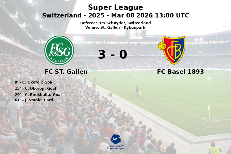 C. Okoroji fue la figura destacada del encuentro, abriendo el marcador tempranamente con dos goles en los minutos 9 y 15, ambos sin asistencia aparente. El dominio del St. Gallen se consolidó aún más con un gol de C. Boukhalfa al minuto 29, ampliando la ventaja a un sólido 3-0 antes de la pausa.